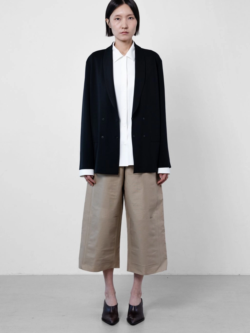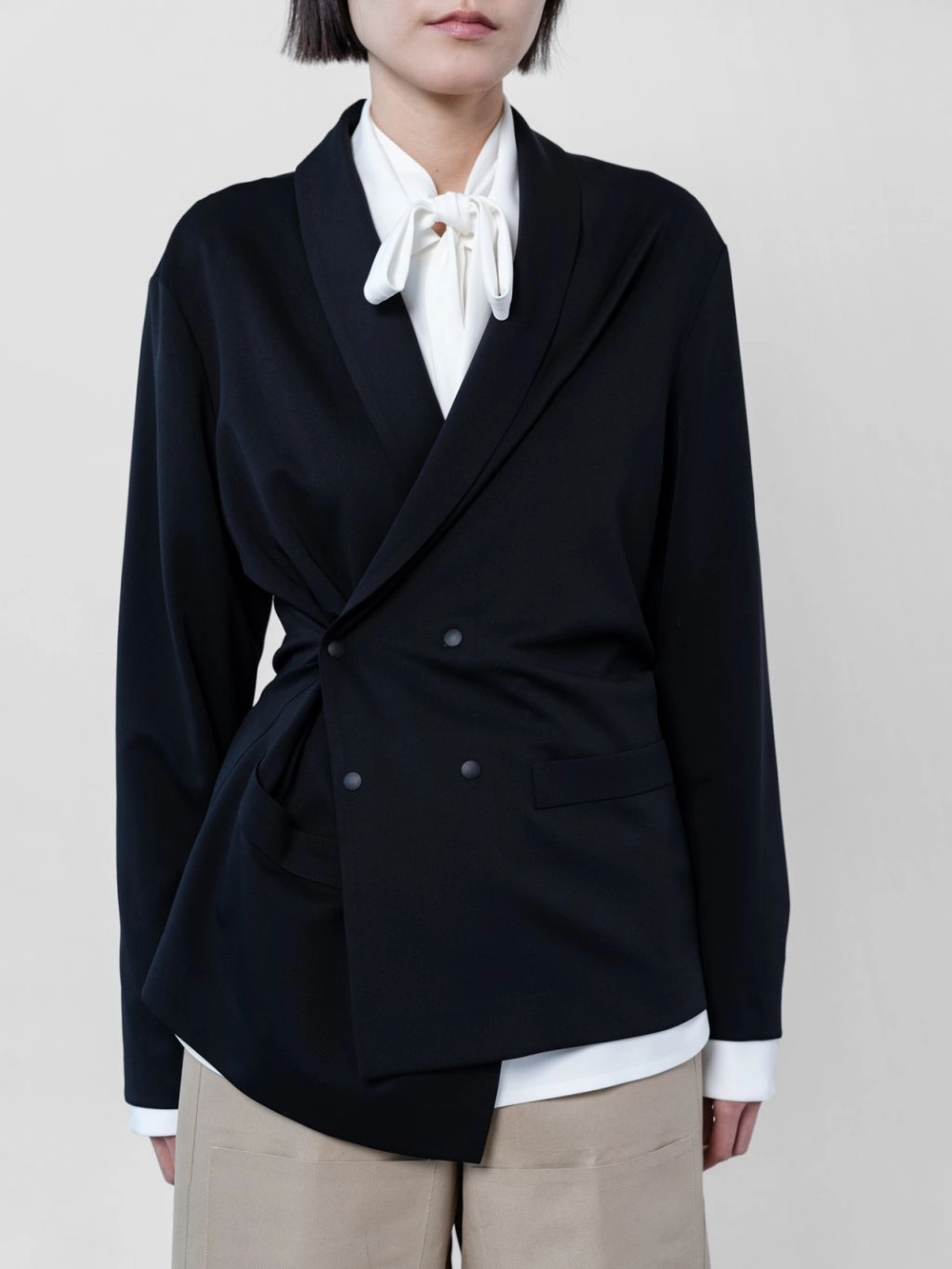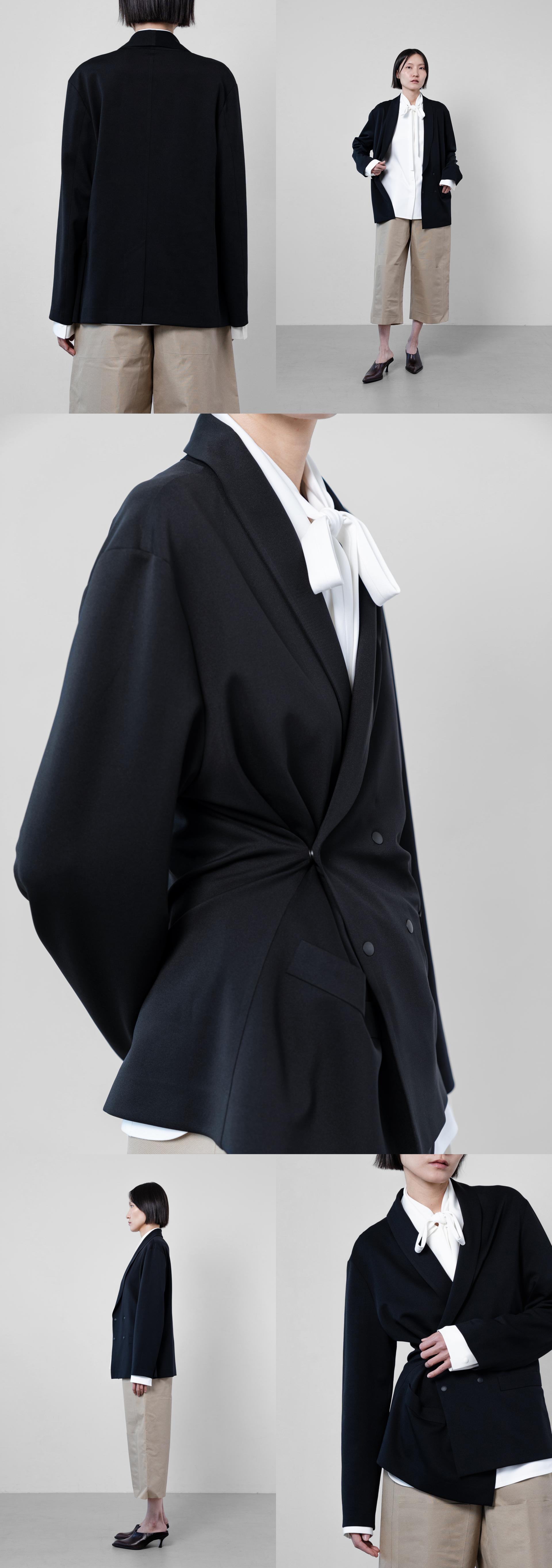 네오폴리의 부드러움과 함께 드랍숄더, 여유 있는 실루엣, 숄카라가 주는 루즈하면서도 우아함이 돋보이는 한 재킷. 사이드에 스냅버튼을 사용하여 타이트한 느낌의 또 다른 연출도 가능.